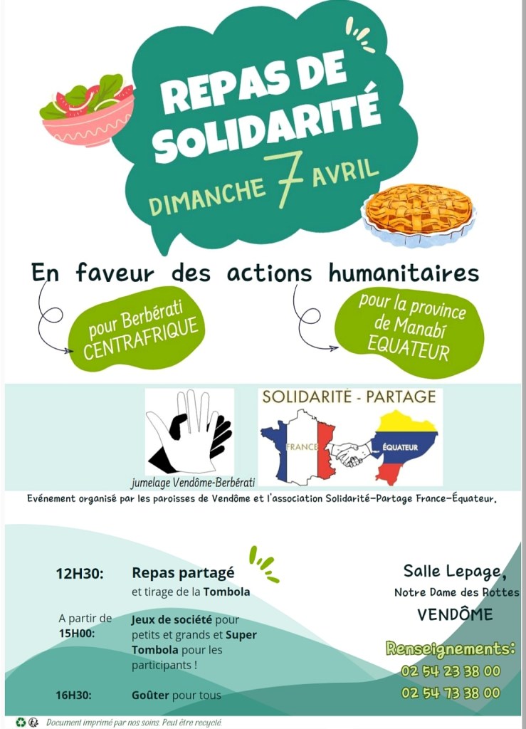 Repas de Solidarité 2024 10 mars 2024 mariemadeleinechopard Laisser un commentaire 🗓️ À vos agendas ! Dimanche 7 avril nous nous retrouverons pour le Repas de Solidarité à Vendôme, nous vous y attendons nombreux, à très vite 👋 Partager : Cliquer pour partager sur X(ouvre dans une nouvelle fenêtre) X Cliquez pour partager sur Facebook(ouvre dans une nouvelle fenêtre) Facebook J’aime chargement…